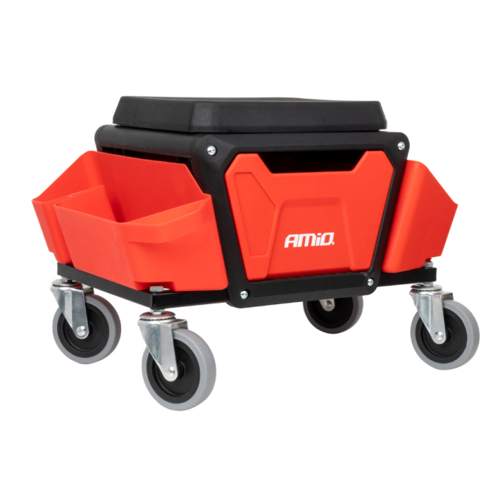 O assento acolchoado garante conforto mesmo em trabalhos prolongados, enquanto as rodas de movimento suave permitem deslocar-se facilmente à volta do veículo ou bancada de trabalho sem se levantar.