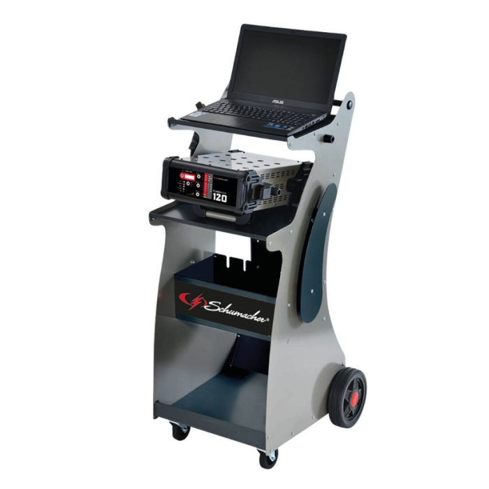 Este carrinho para carregadores de bateria e equipamentos de diagnóstico oferece uma solução prática e organizada para oficinas e espaços técnicos.