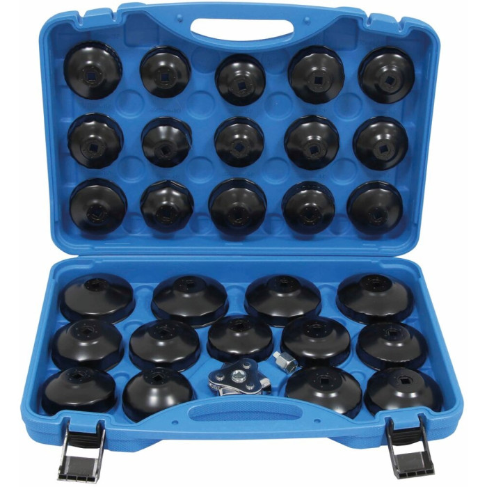 Este Conjunto dechaves para Filtros de Óleo – 30 Peças permite desmontar filtros de óleo tanto para sistemas de cartucho como filtros roscados tradicionais.