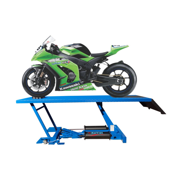 Elevador amplo e com boa altura de trabalho para intervenções completas em motociclos.