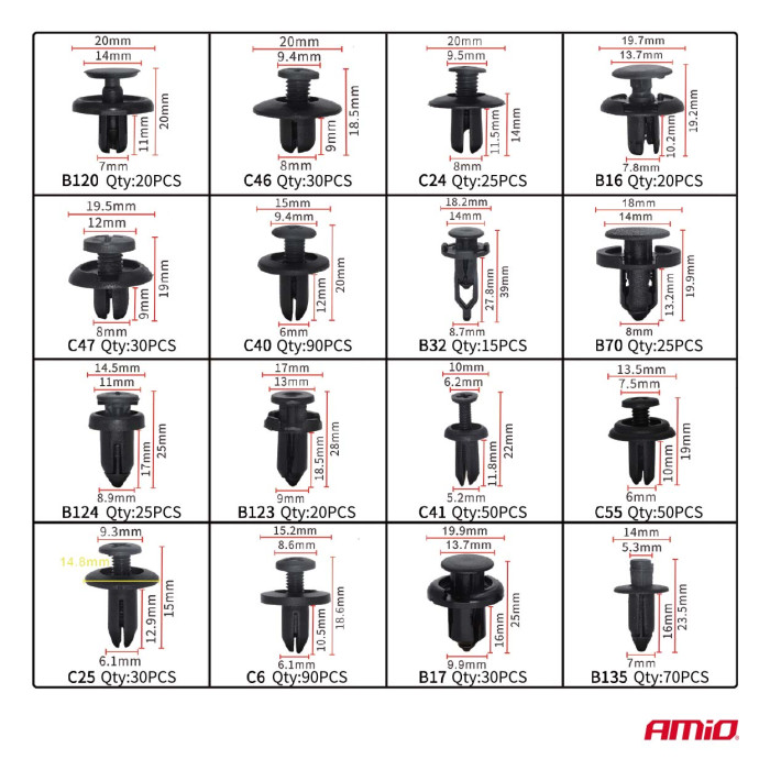O Kit Clips de Carro AMiO oferece 650 peças que cobrem uma ampla variedade de clips, rebites e fixadores plásticos usados habitualmente em automóveis, veículos de carga leves e indústrias especiais.